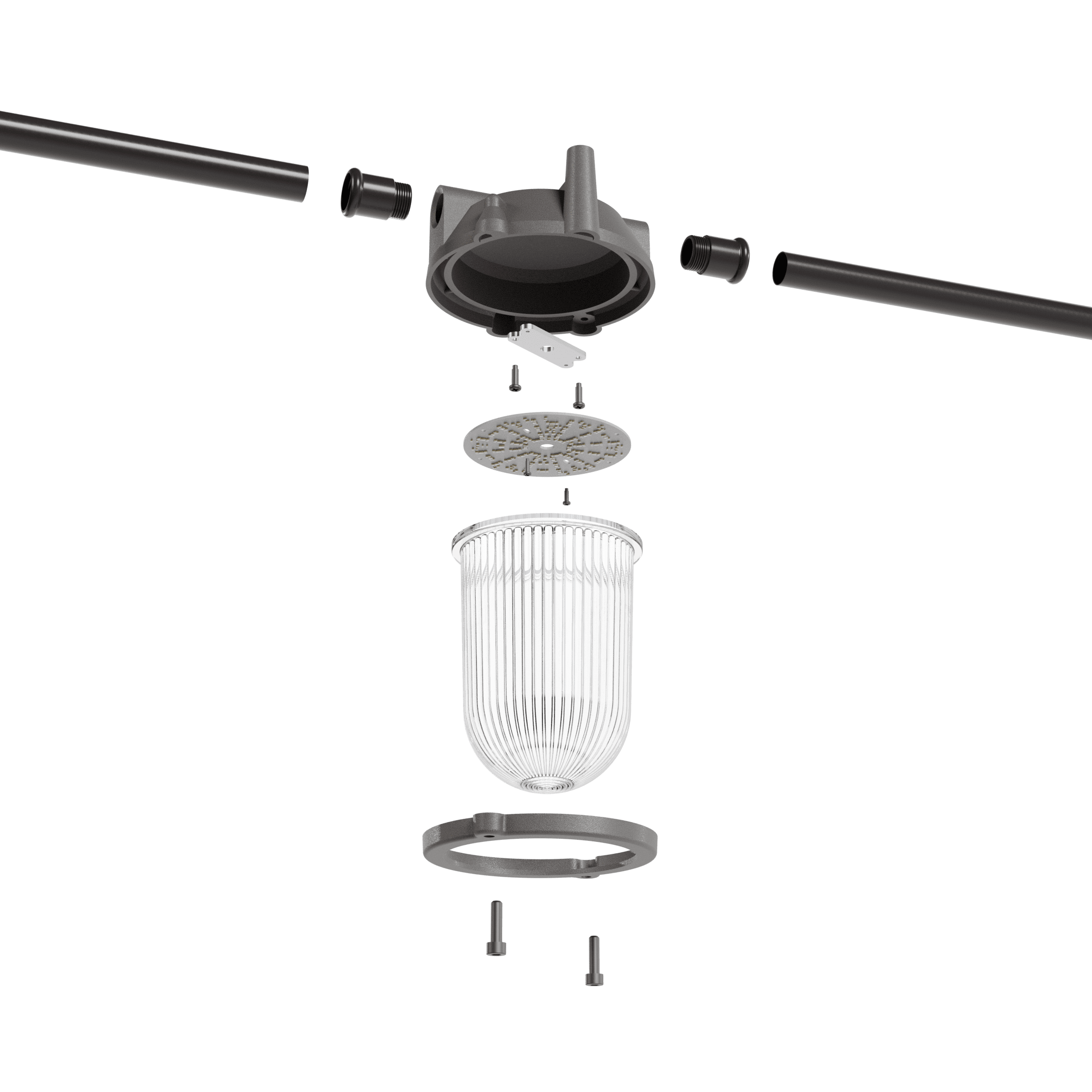 The diffuser in borosilicate glass with a high thickness and dome shape gives an elegant and rigorous look. The die-cast aluminium body, embellished with the Metal finish, is combined with the Genuit visible systems system, allowing great compositional freedom in domestic and contract contexts. It is available in Small, Medium and Large sizes.