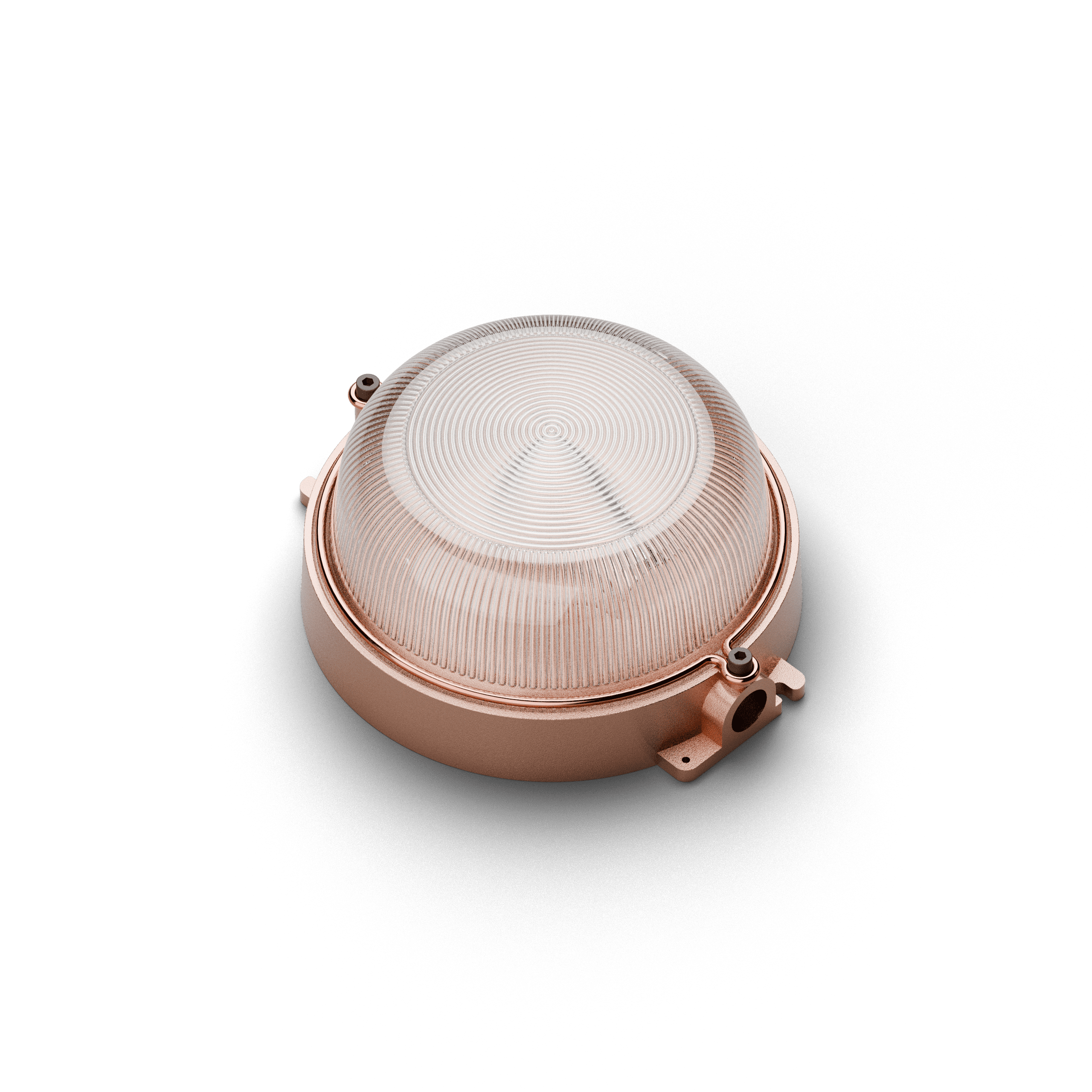 Il diffusore in vetro borosilicato rigato ad alto spessore conferisce un aspetto robusto e compatto. Il corpo inferiore in alluminio pressofuso, impreziosito dalle finiture brillanti Metal, si abbina al sistema di impianti a vista Genuit, consentendo grande libertà compositiva nei contesti domestici e contract. È disponibile in versione ovale in due misure, Small e Medium, pensata sia per indoor che outdoor.